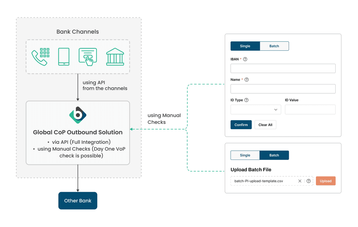 - Manual Checks by uploading batch files using Portal, that accepts pain.001 and .xls files in specific format